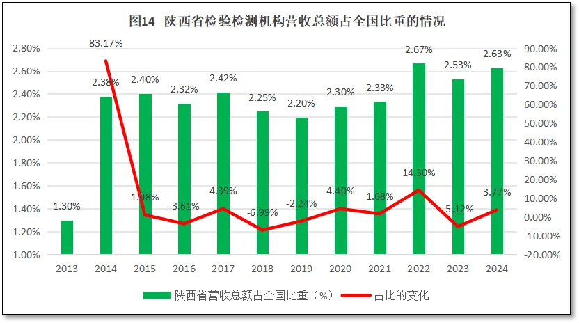 由图14可见,陕西省检验检测机构营收总额在全国检验检测行业营收总额中的比重在2014年达到2.38%之后总体来看变动不大,呈现轻微波动的发展特点,2024年占比为2.63%。从增长率曲线来看,从2015年起,陕西省检验检测机构营收总额占比的增长率总体稳定,仅在2022年有一个14.3%的增长高峰,11年来的年均增幅为1.17%,说明陕西省检验检测机构营业状况比较平稳,与全国发展速度十分接近,占比基本上没有大的变化。