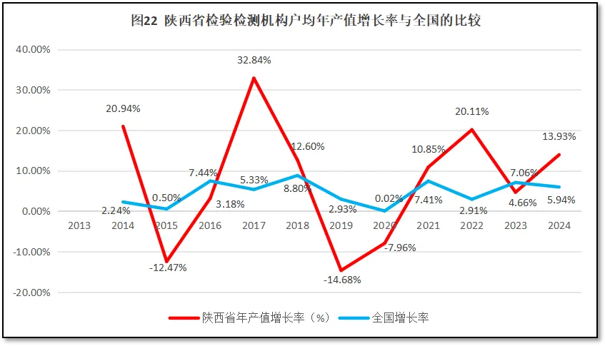 再来看陕西省检验检测机构人均年产值增长率与全国人均年产值增长率的比较,如图19所示。