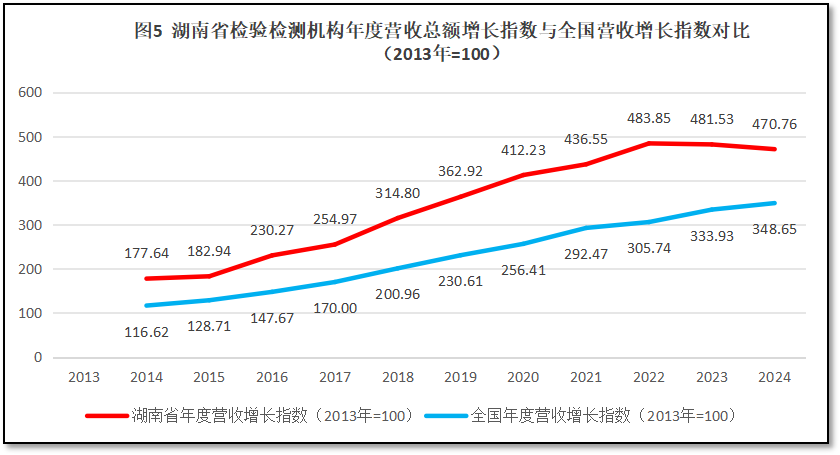 由图5可见,湖南省检验检测机构营收总额增长指数一直保持着高于全国平均数的水平发展,曲线始终高于全国平均线,但最近几年曲线呈现缓慢下降的趋势,与全国指数差距逐步减小,存在明显的“发展刹车”现象,到2024年增长指数相差122左右,比2022年170左右的差距已经大为缩小,这说明湖北省检验检测行业发展出现显著问题,需要引起当地同行的重视。